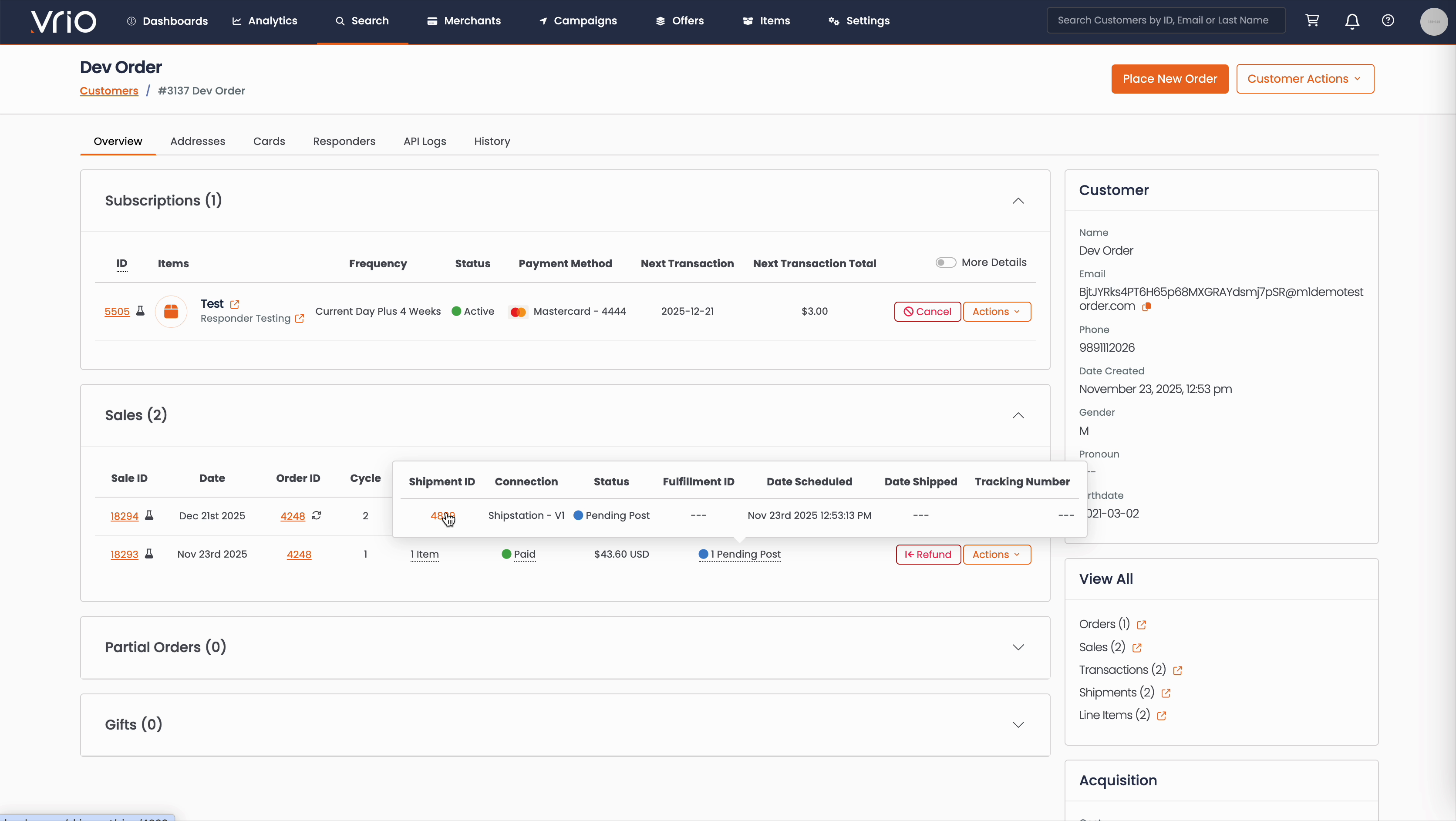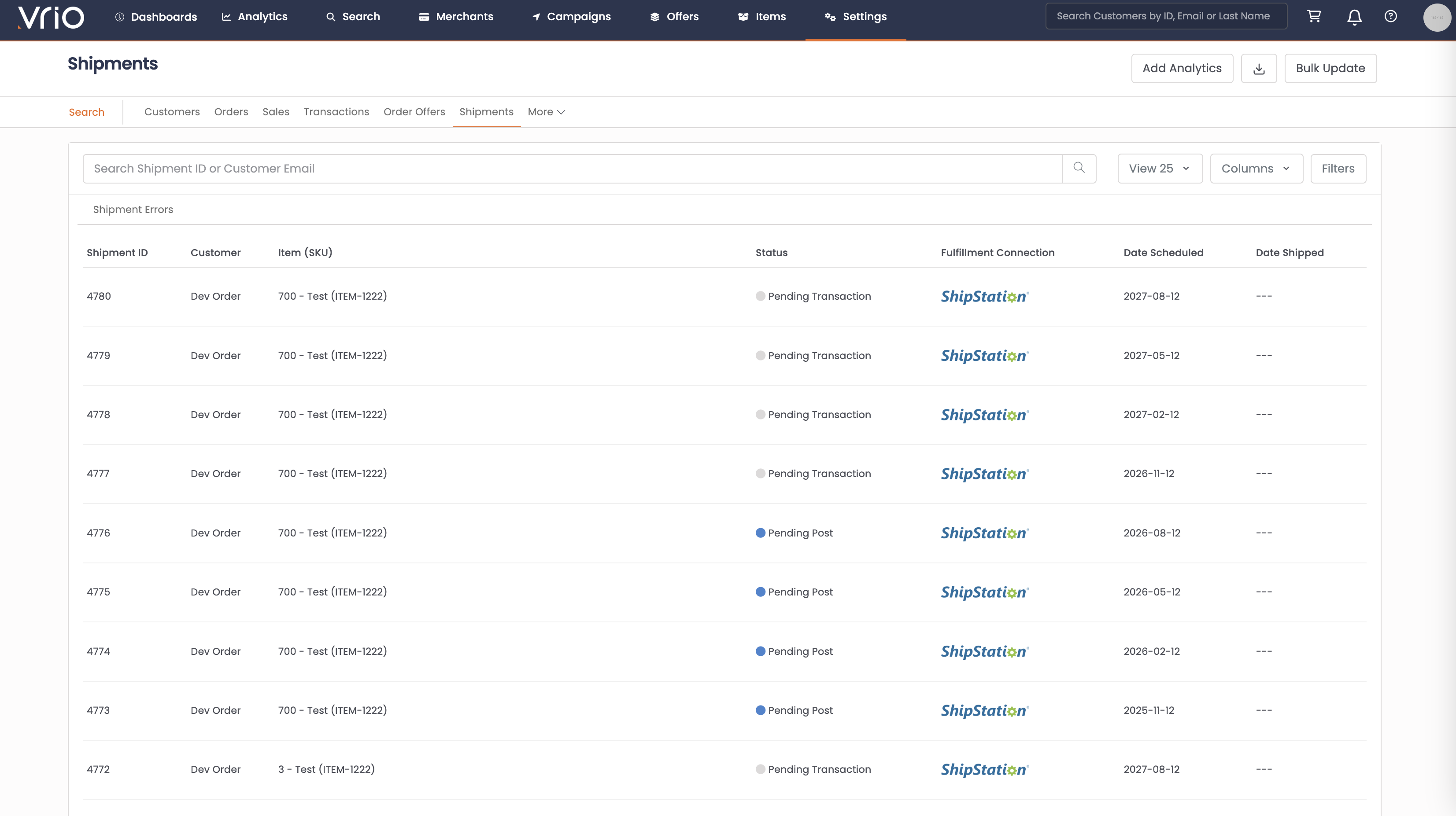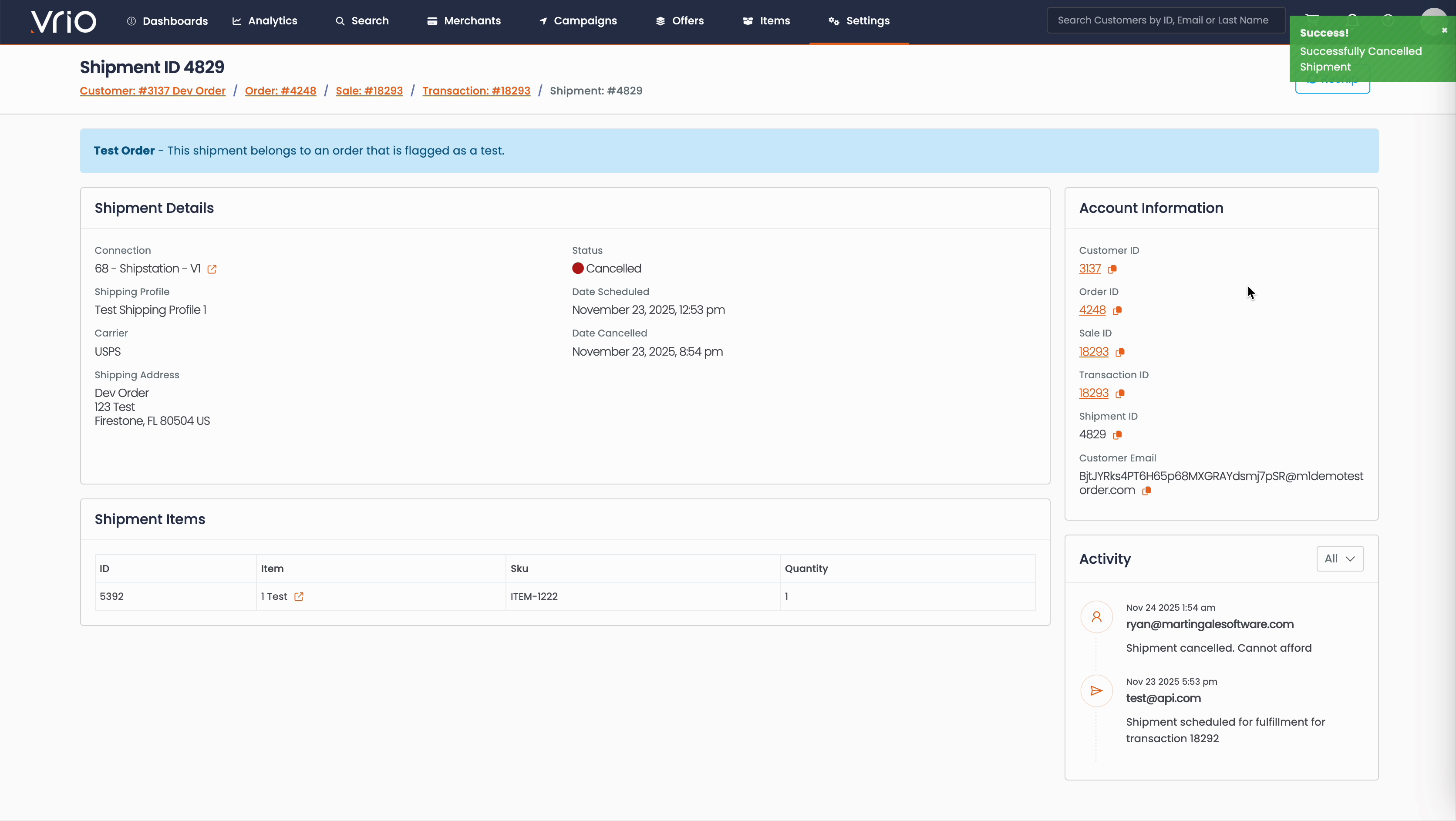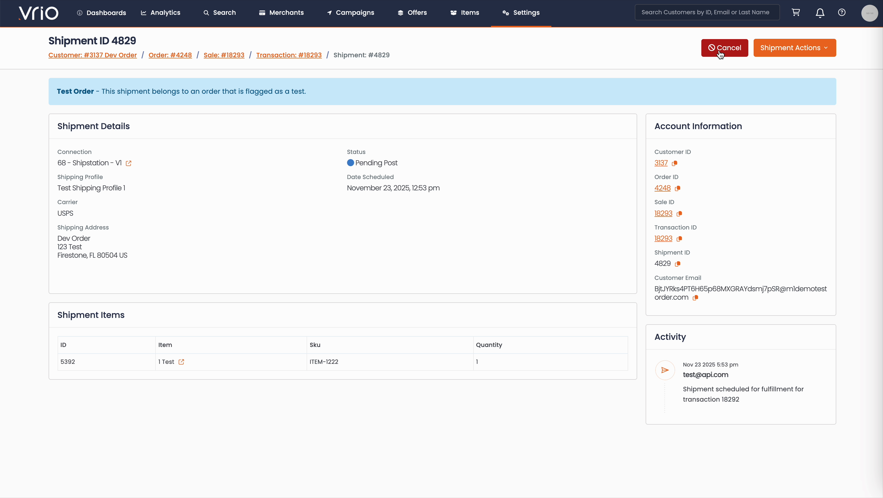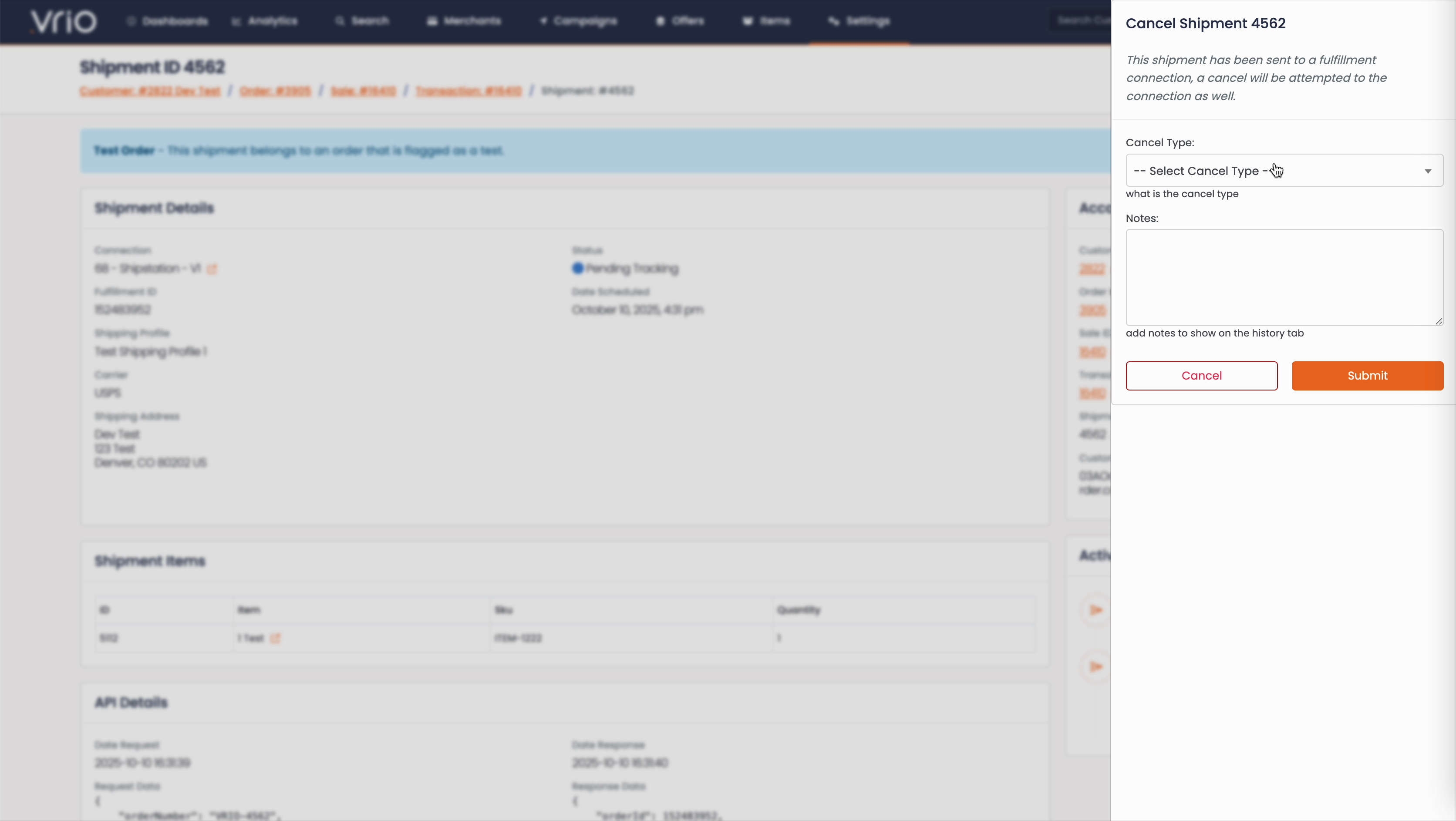Cancel shipments in Vrio to stop delivery to customers. Vrio will attempt to cancel the shipment with the fulfillment connection if it has already been sent.