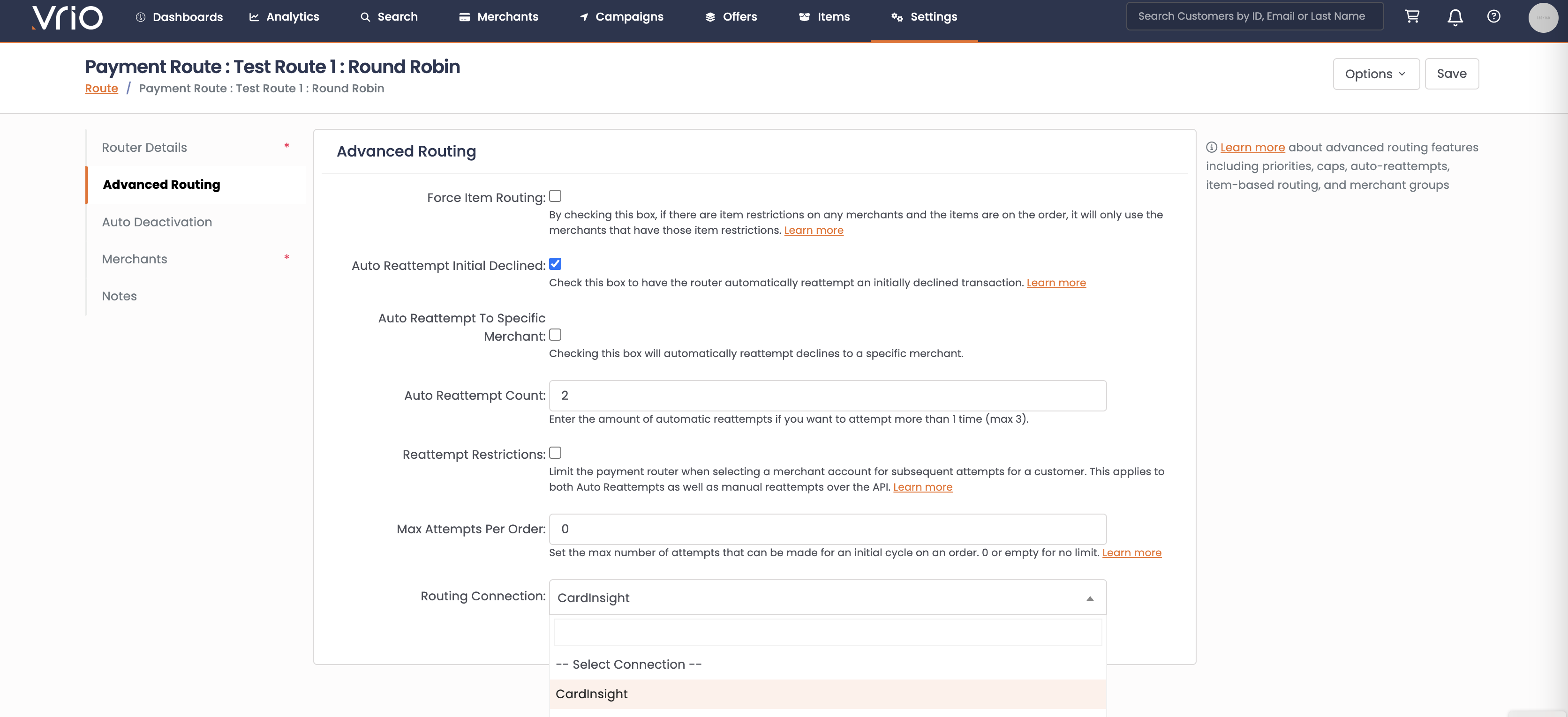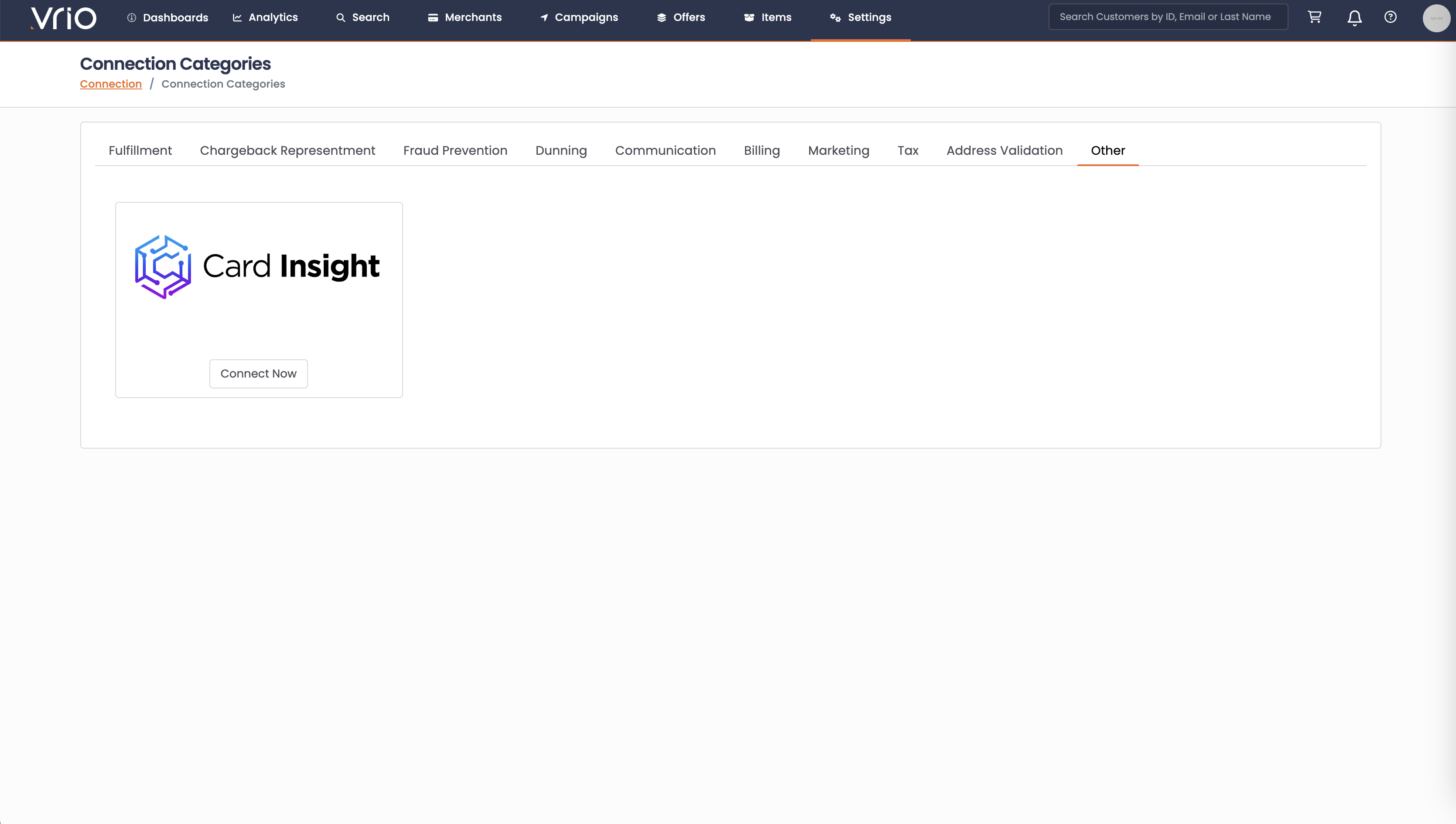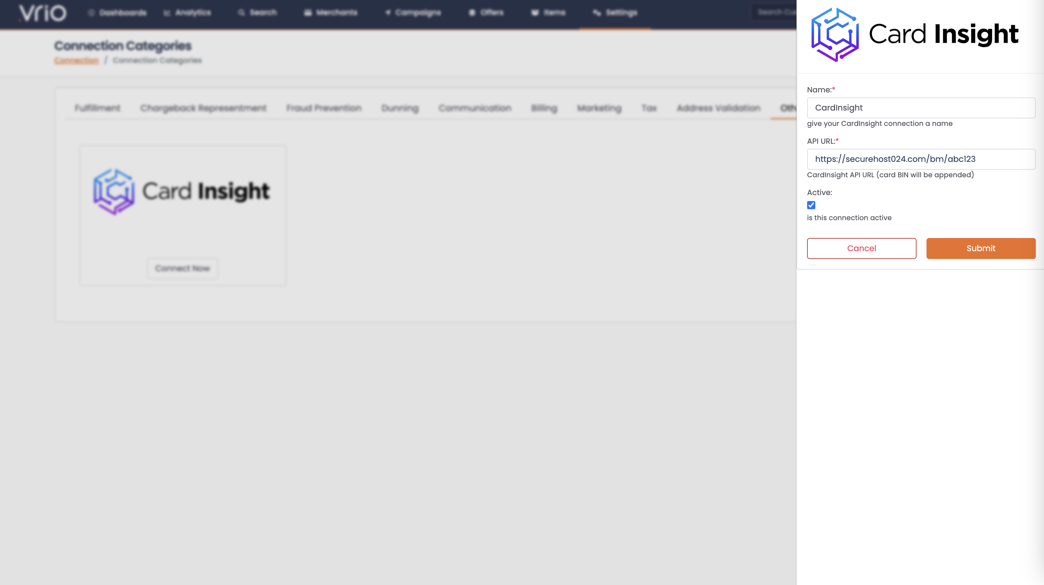 Connect Vrio with Card Insight for intelligent BIN-based merchant routing that optimizes approval rates by analyzing card characteristics and recommending the best merchant for each transaction.