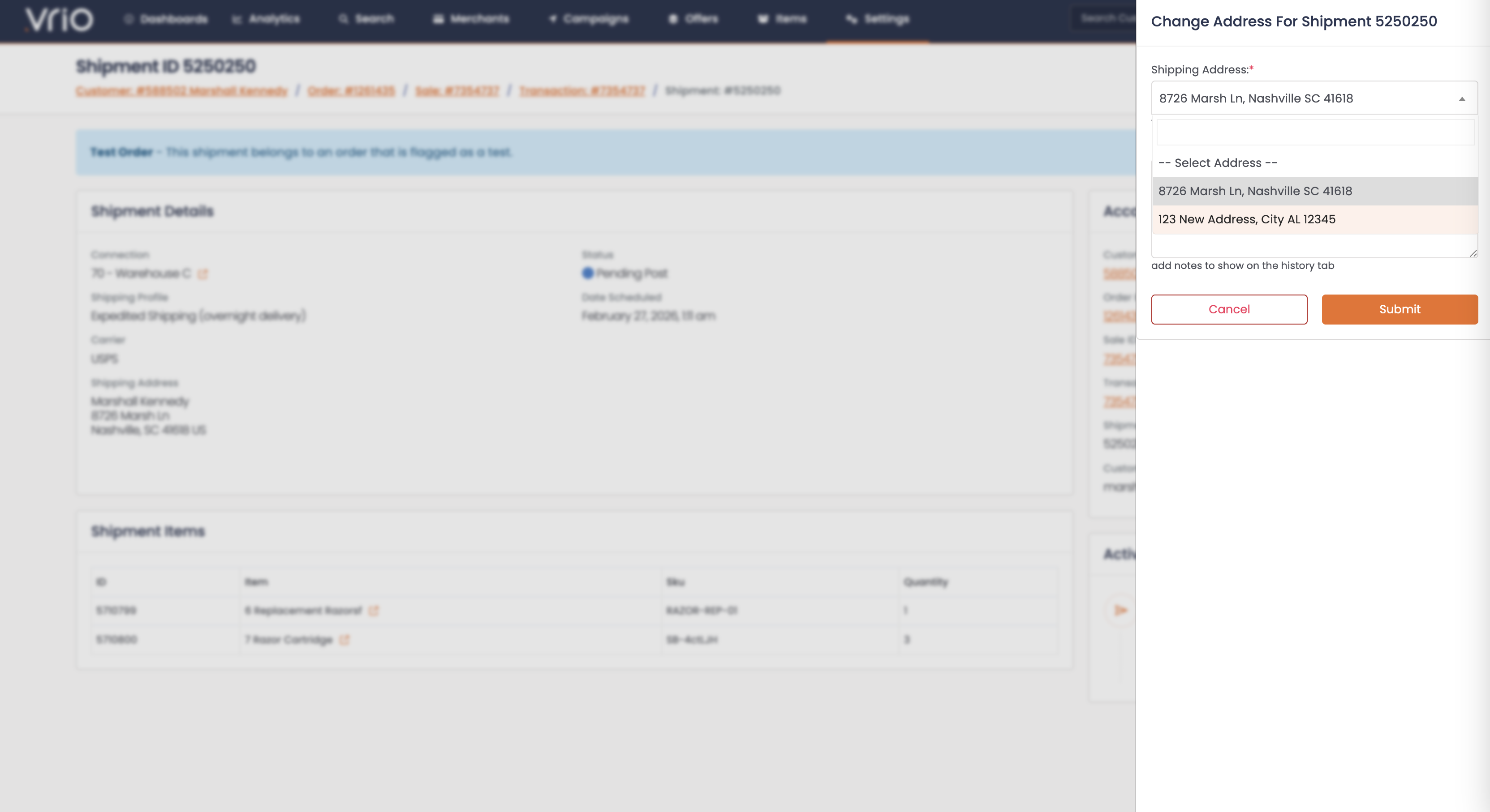 - Shipment updated — The shipment record is updated with the new shipping address. Old and new address values are logged in the shipment notes.