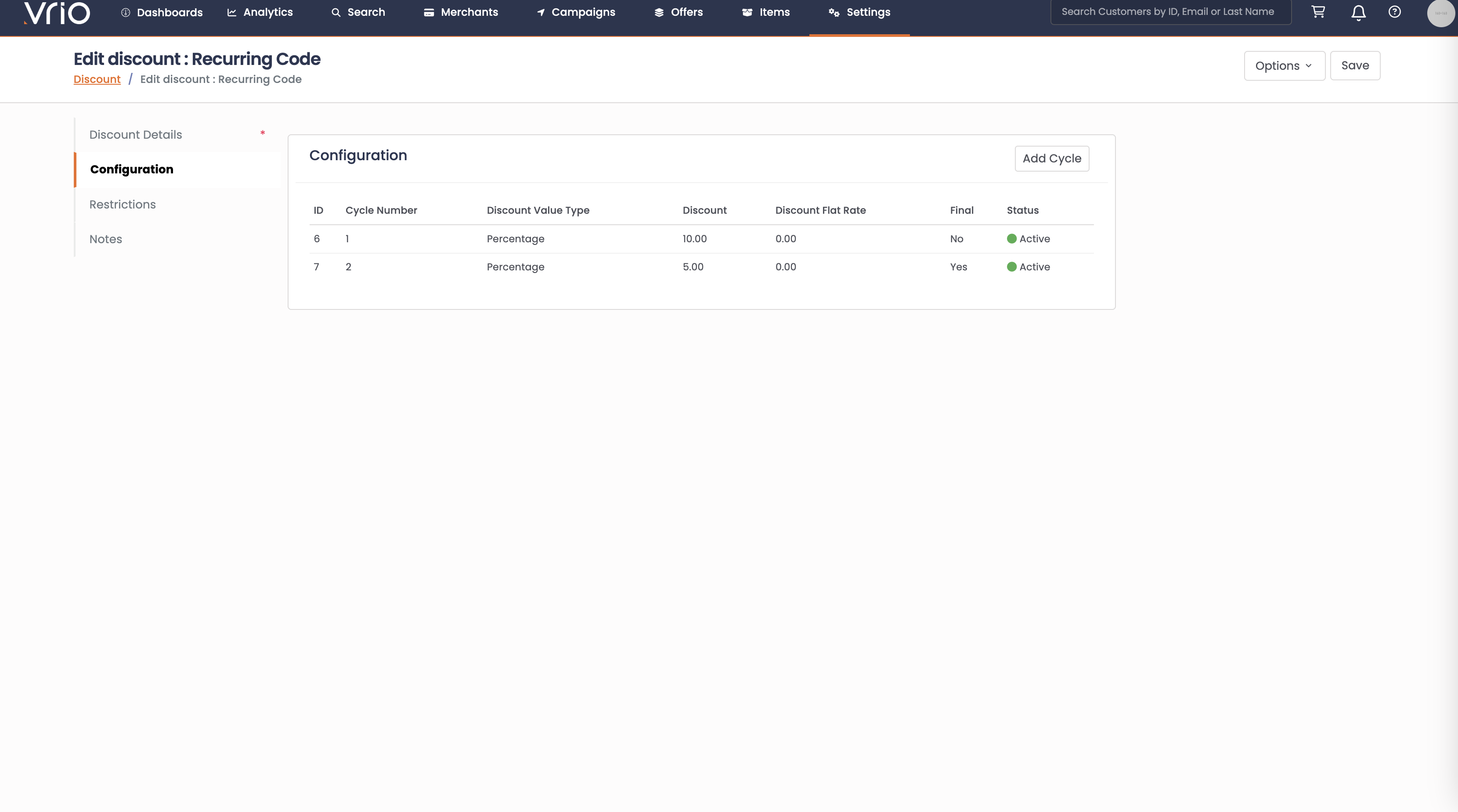 Below is an example of a discount code where the initial discount is 10% off. Then for cycle 2 its 5% off. Marked as Final Cycle so there are no further discounts. If the last cycle is not marked as final, all renewals will be given the 5% discount until the subscription is cancelled.