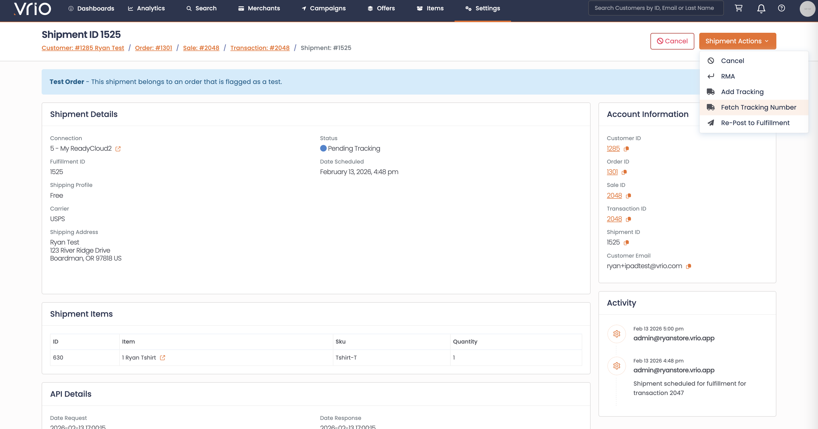 Fetching a tracking number manually pulls the tracking information from the fulfillment connection for a shipment that has been posted but hasn't received tracking yet. Most fulfillment connections provide tracking automatically, but this action lets you trigger the fetch on demand.