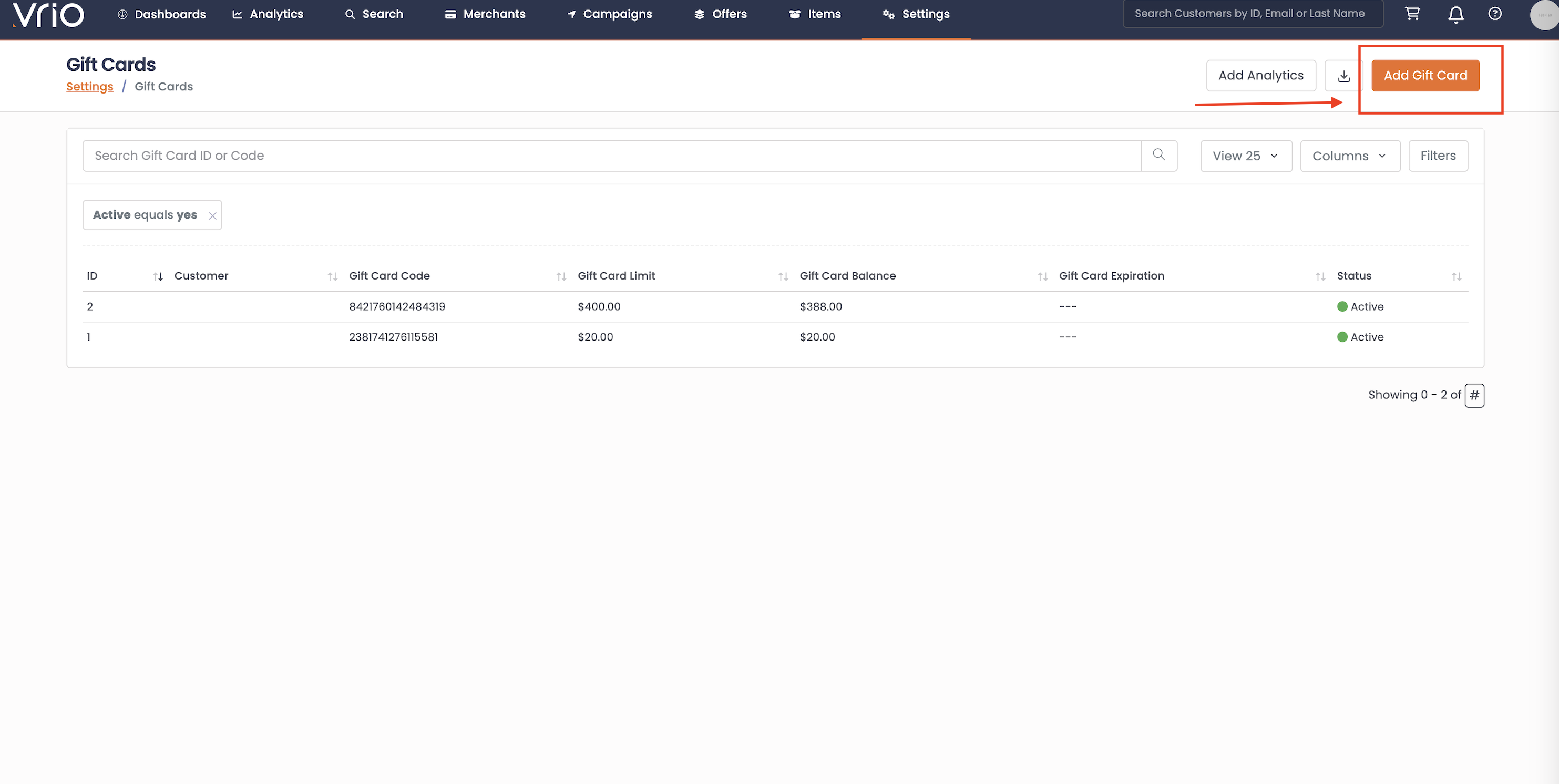 You can view and manage all gift cards from Settings > Gift Cards in the Vrio admin.