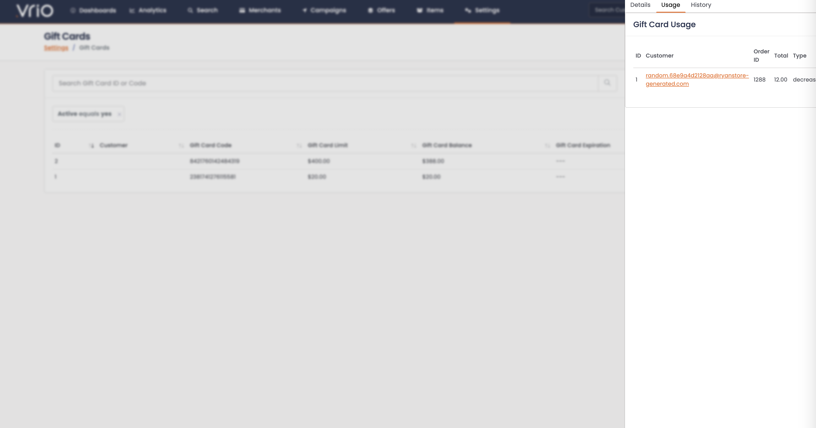Click on any gift card to view its details and usage history. The Usage tab shows all orders where the gift card has been applied, including: