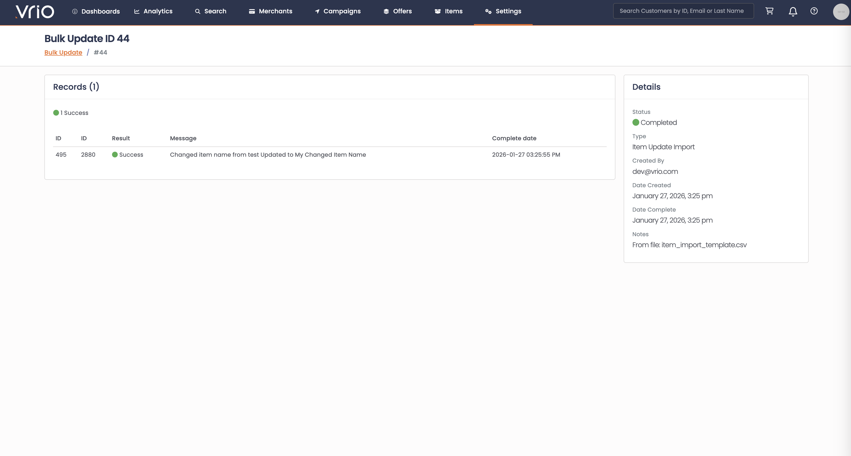 Use the Bulk Update Import tool to update records in bulk using CSV files. Supports updating merchants, campaigns, offers, items, transactions, shipments, and more.