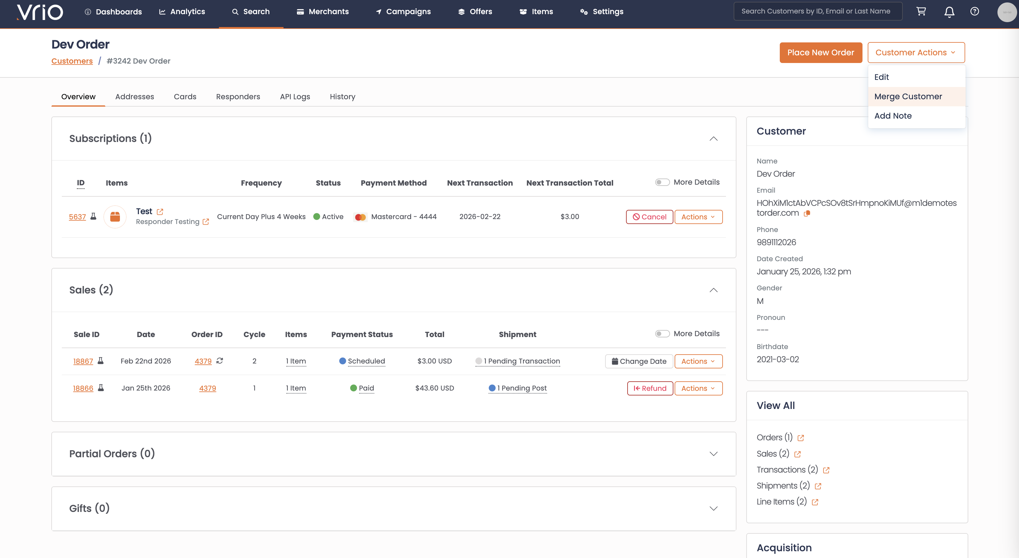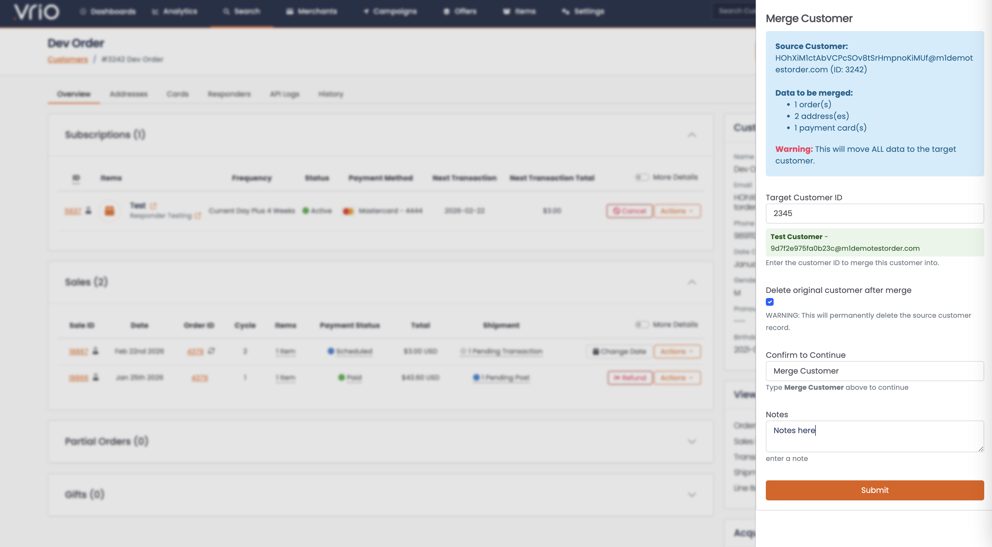 Merge duplicate customer records to consolidate all data into a single account. This moves all orders, addresses, payment cards, and other associated data from one customer (source) to another (target).