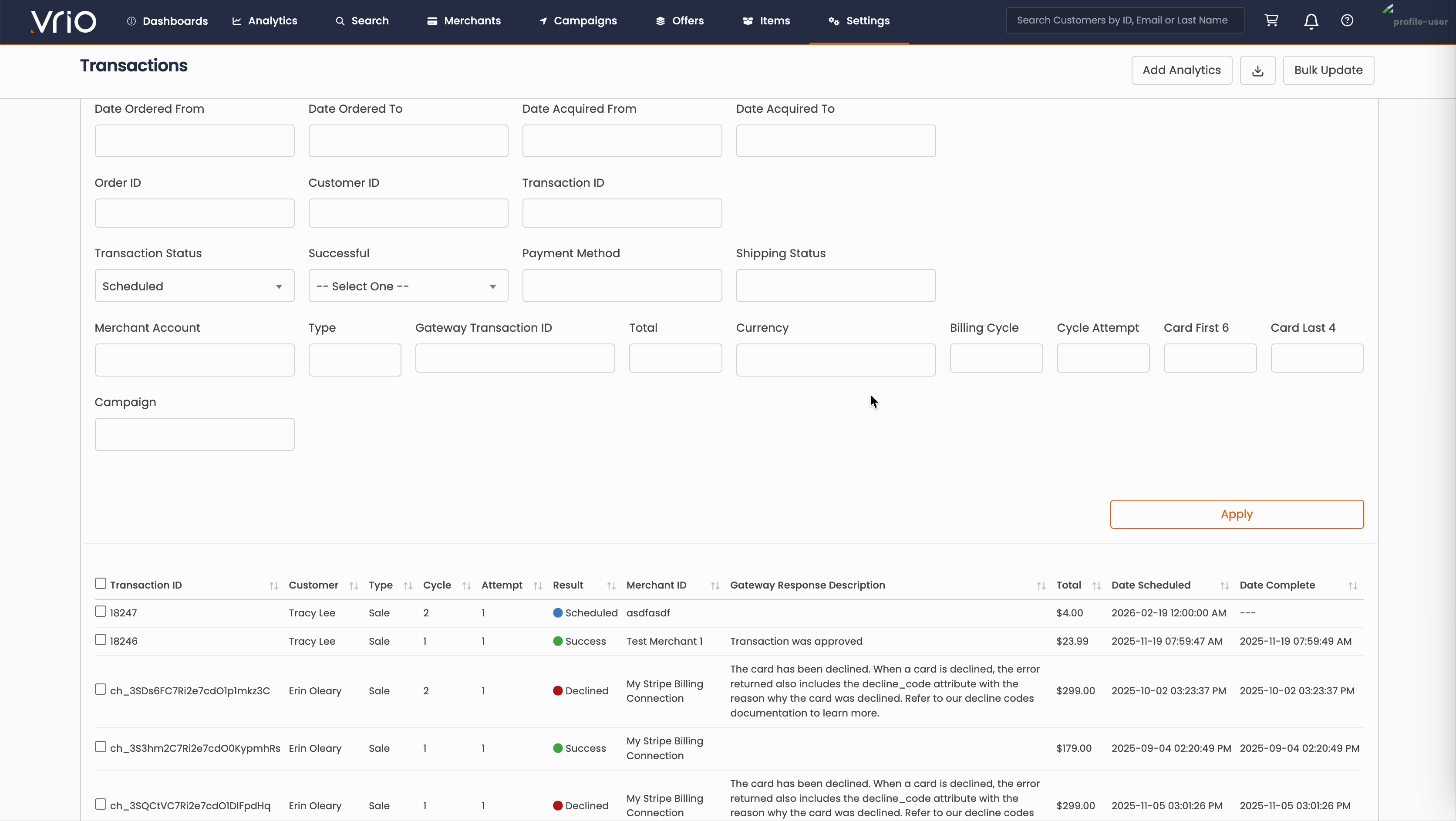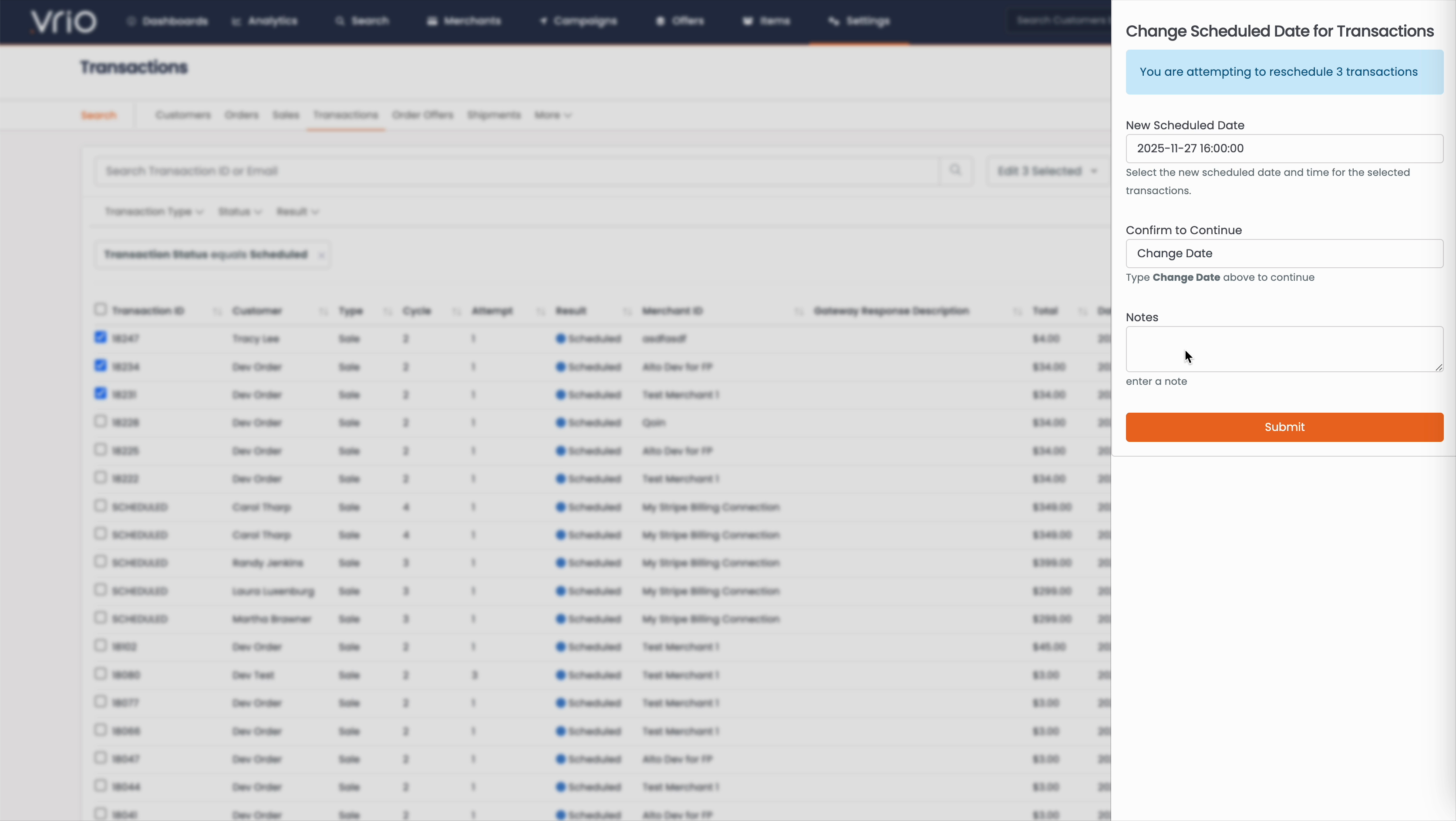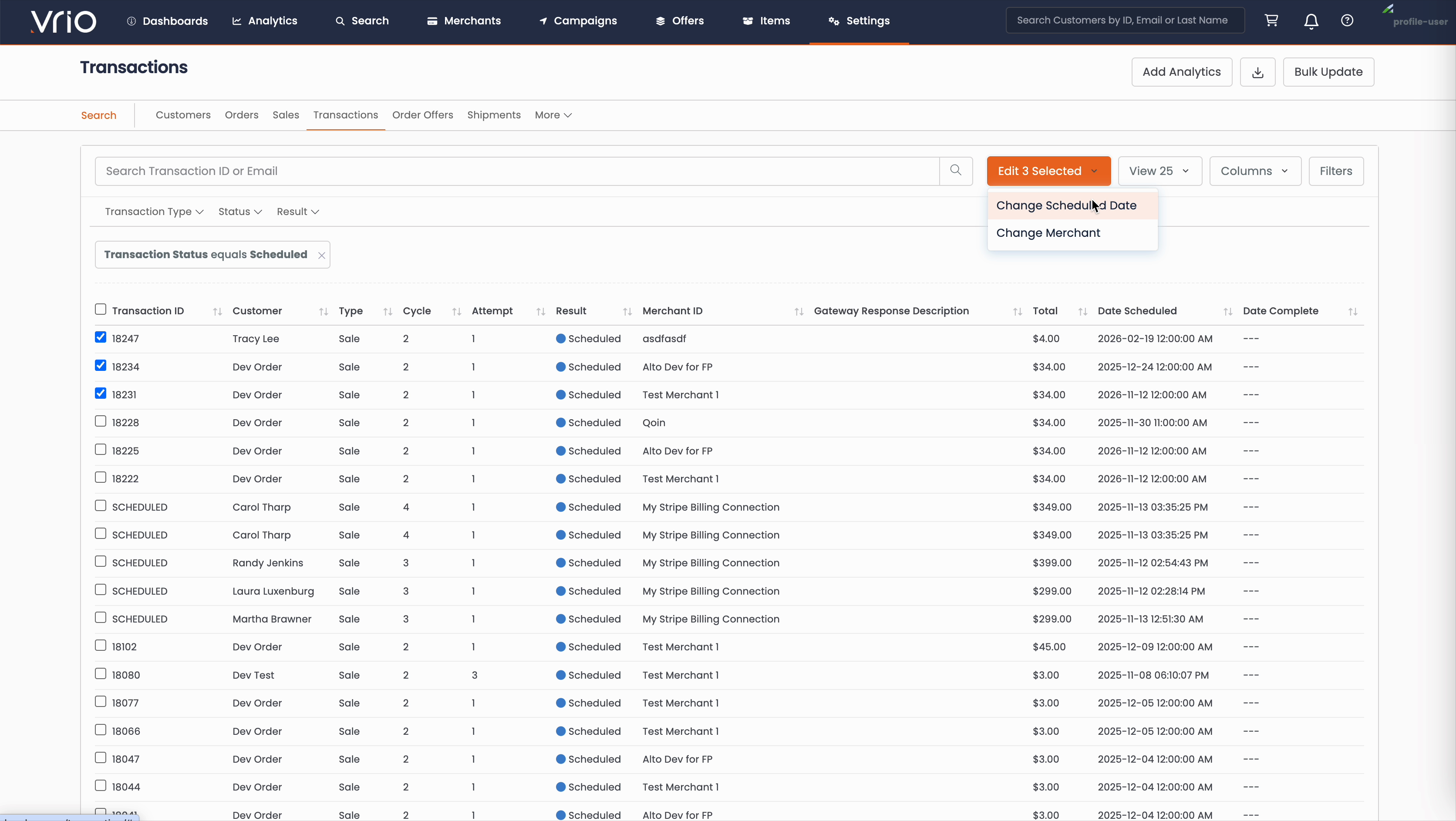 Bulk modify scheduled transactions by changing the merchant account or rescheduling the transaction date for multiple transactions at once.