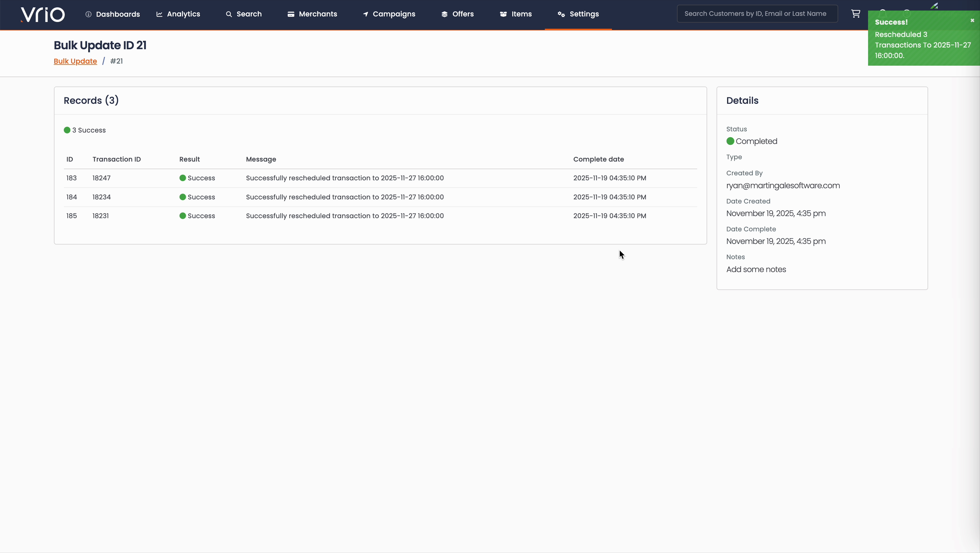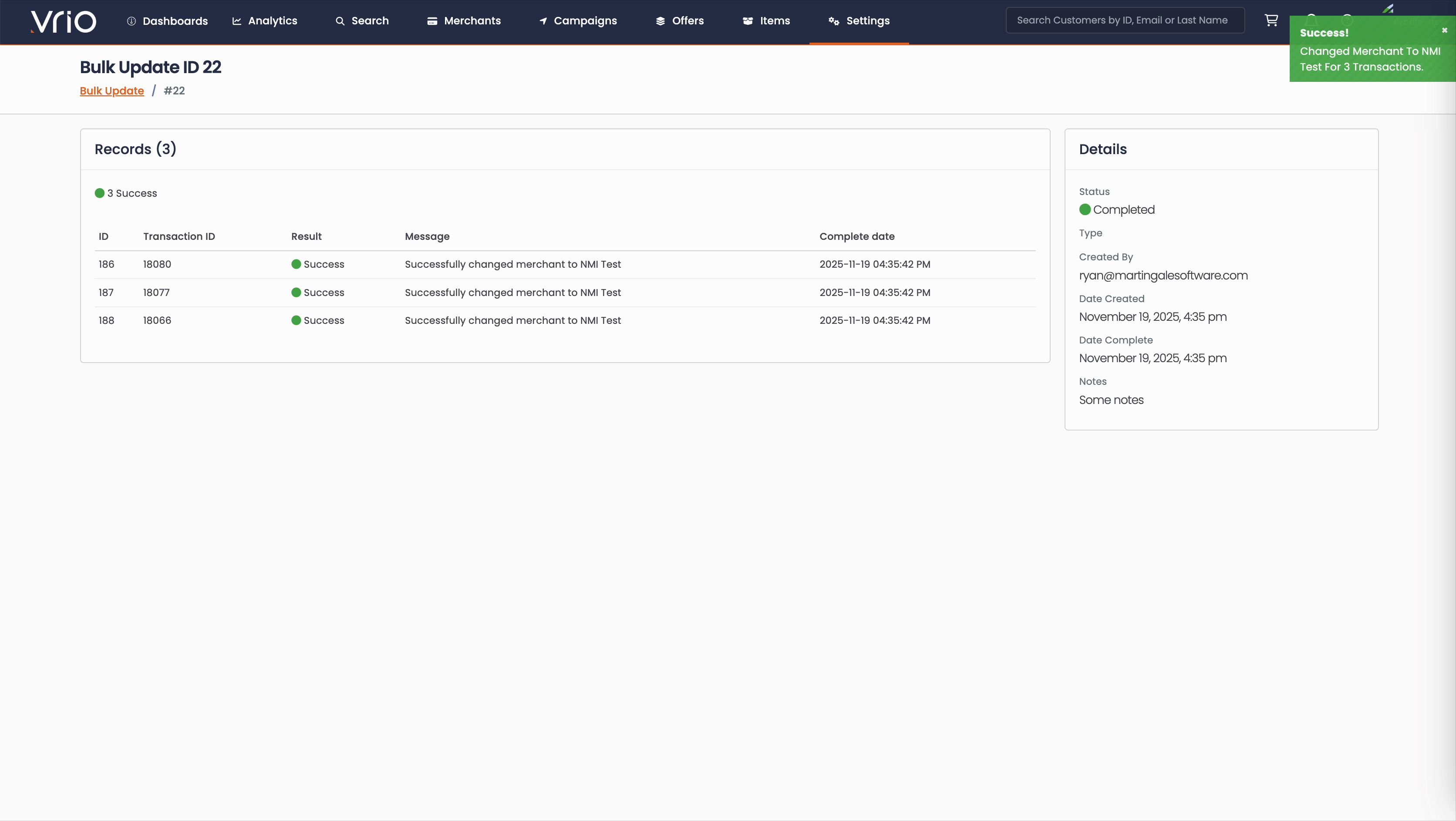 You will be taken to a Bulk Update results page showing the outcome for each transaction: