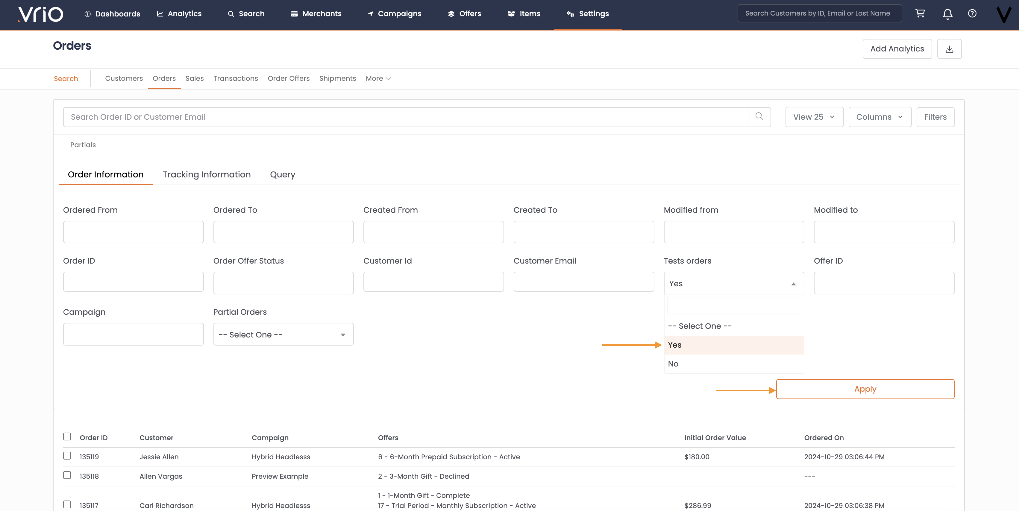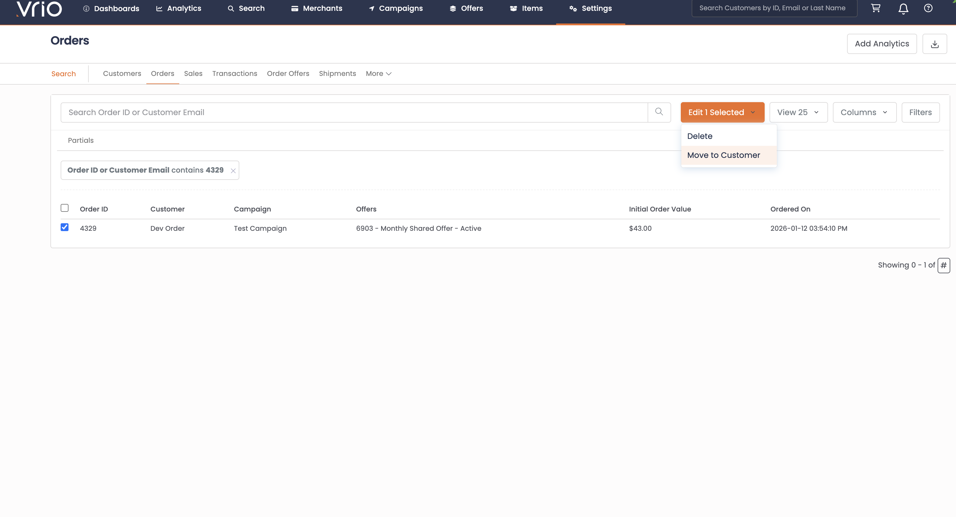 Bulk move orders from one customer to another in Vrio. Useful for consolidating duplicate customer accounts or correcting order assignments.