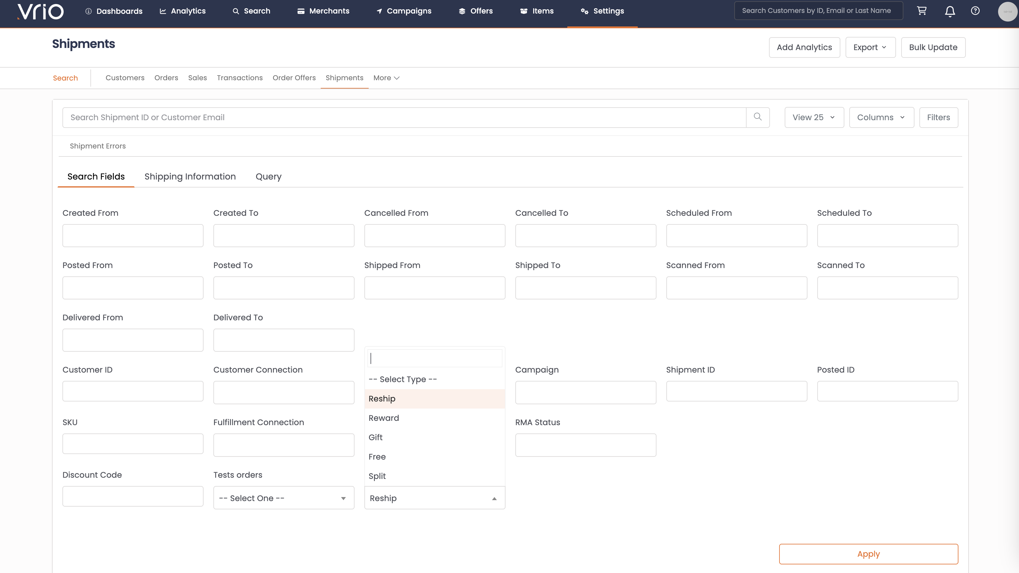 - Navigate to Search → Shipments tab