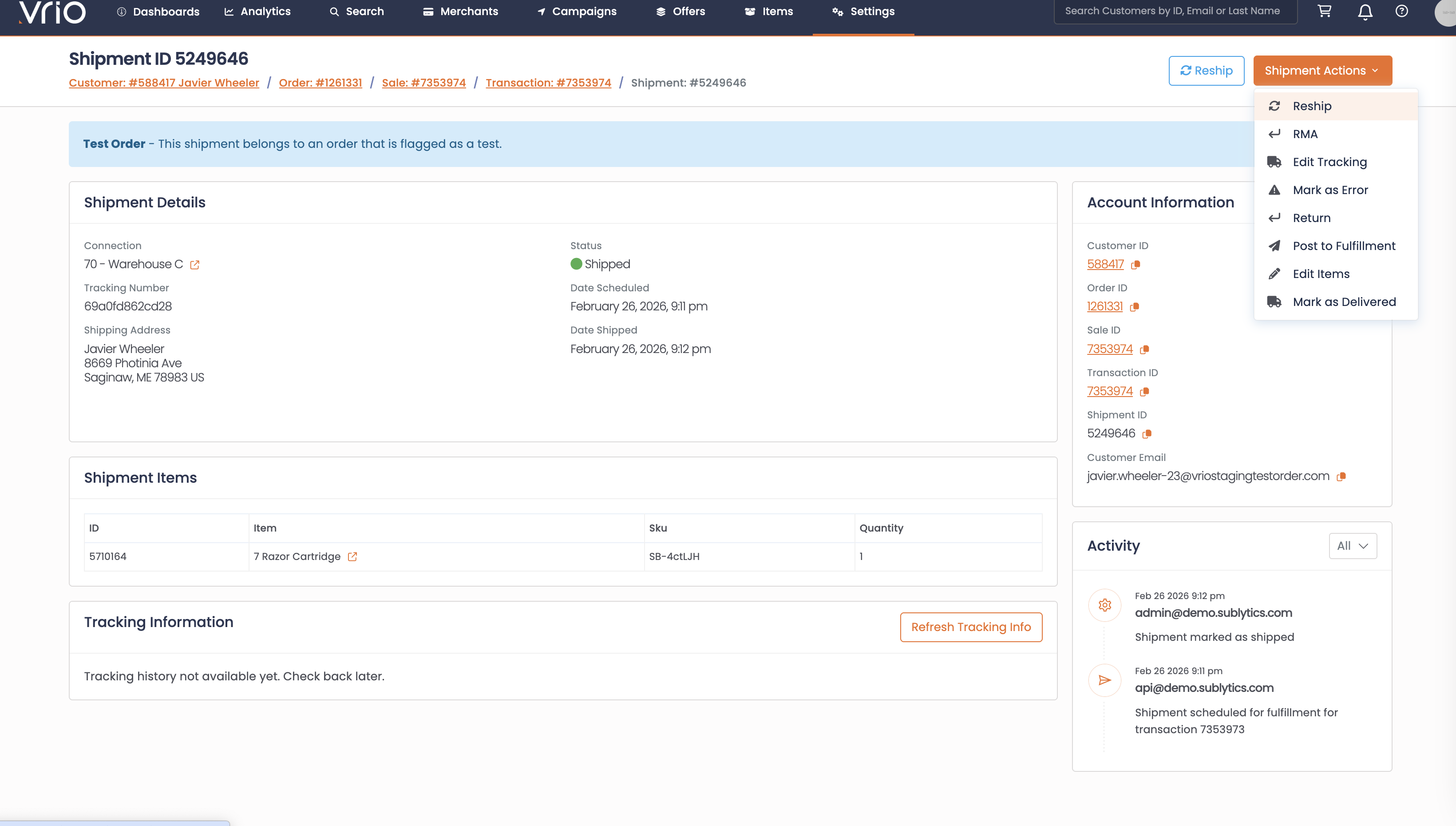 Scheduled 15 minutes out — The new shipment is scheduled 15 minutes in the future, giving you time to make edits (e.g., change address or items) before it posts to fulfillment