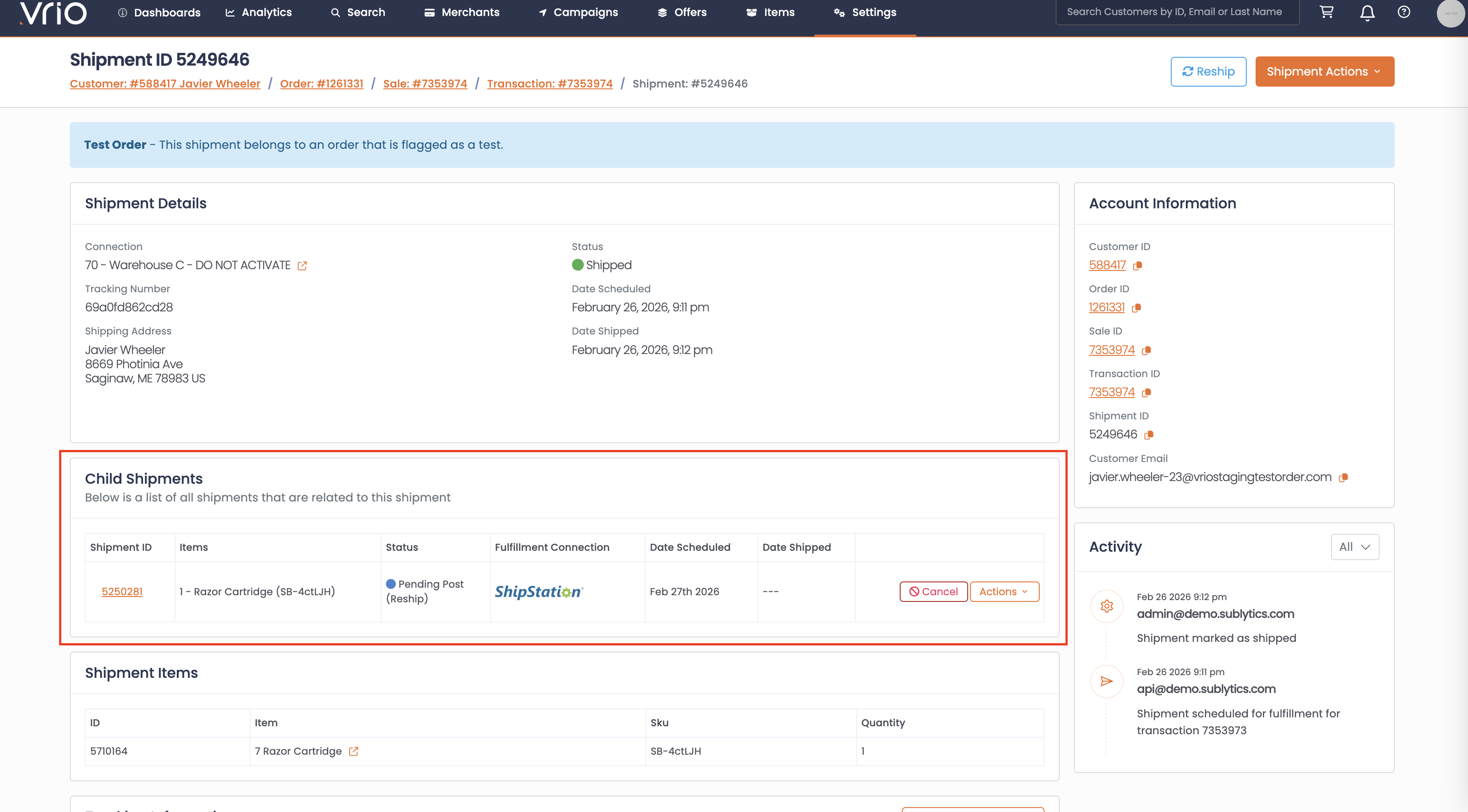 Child shipment created — A new shipment is created with the type Reship, linked to the original shipment
