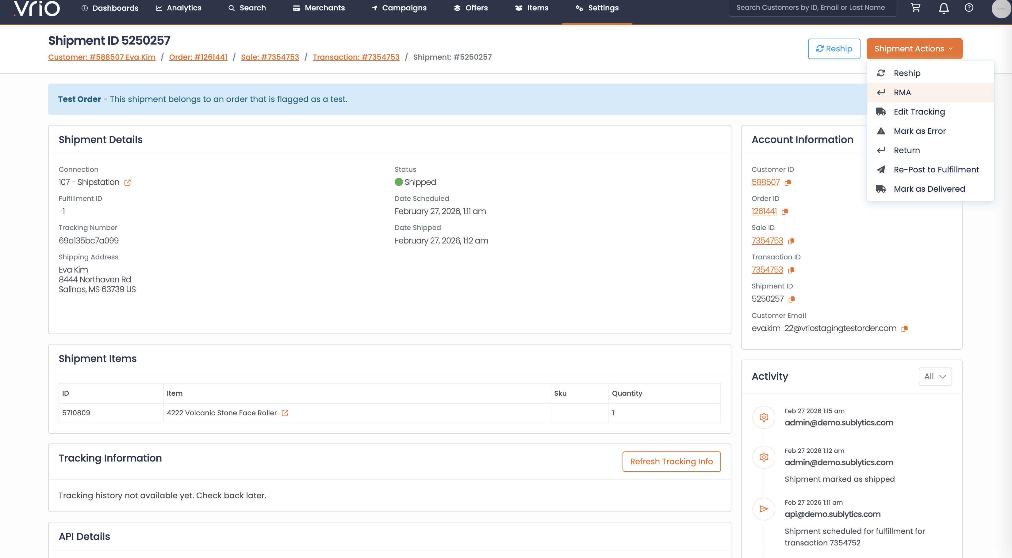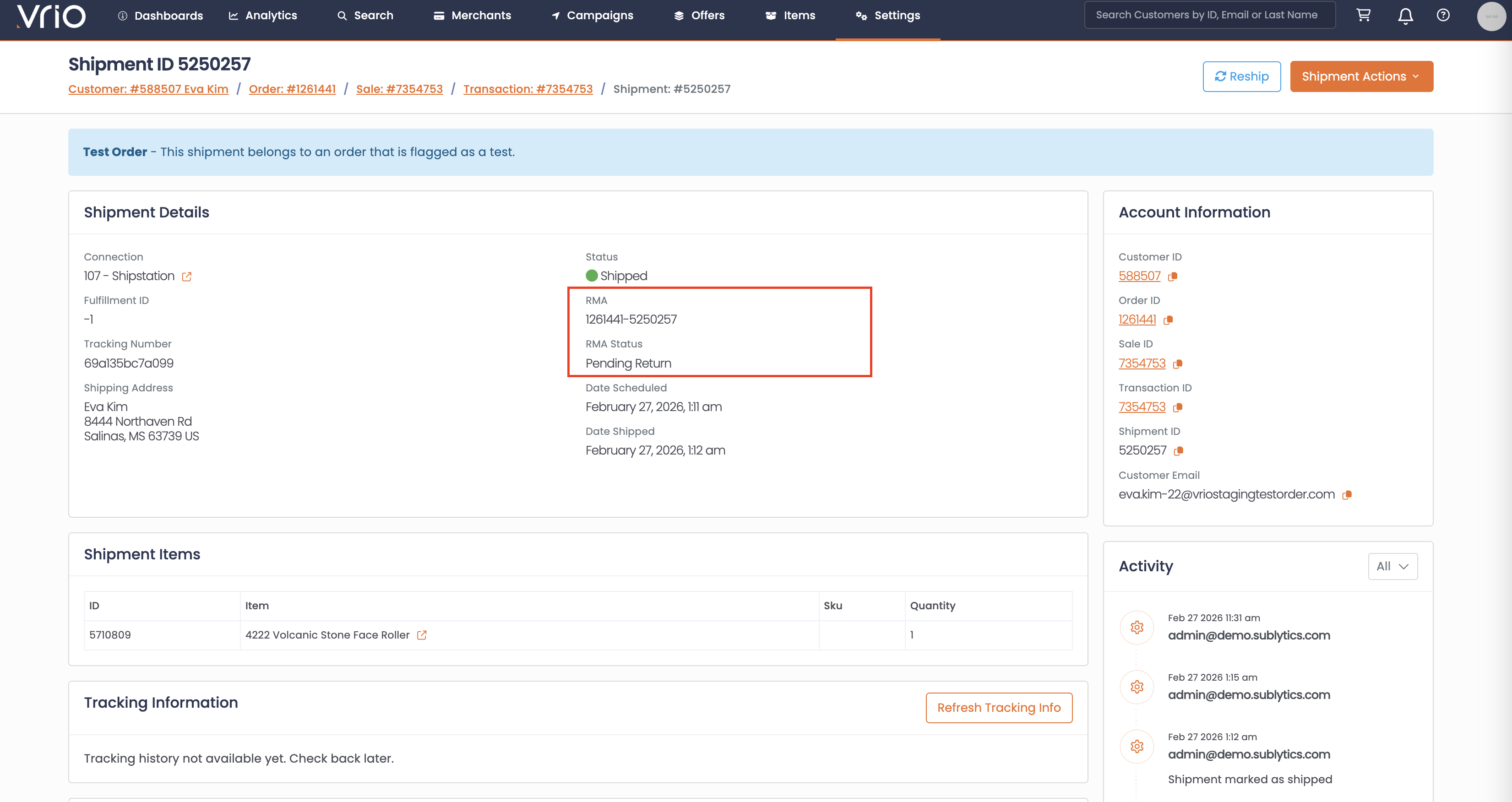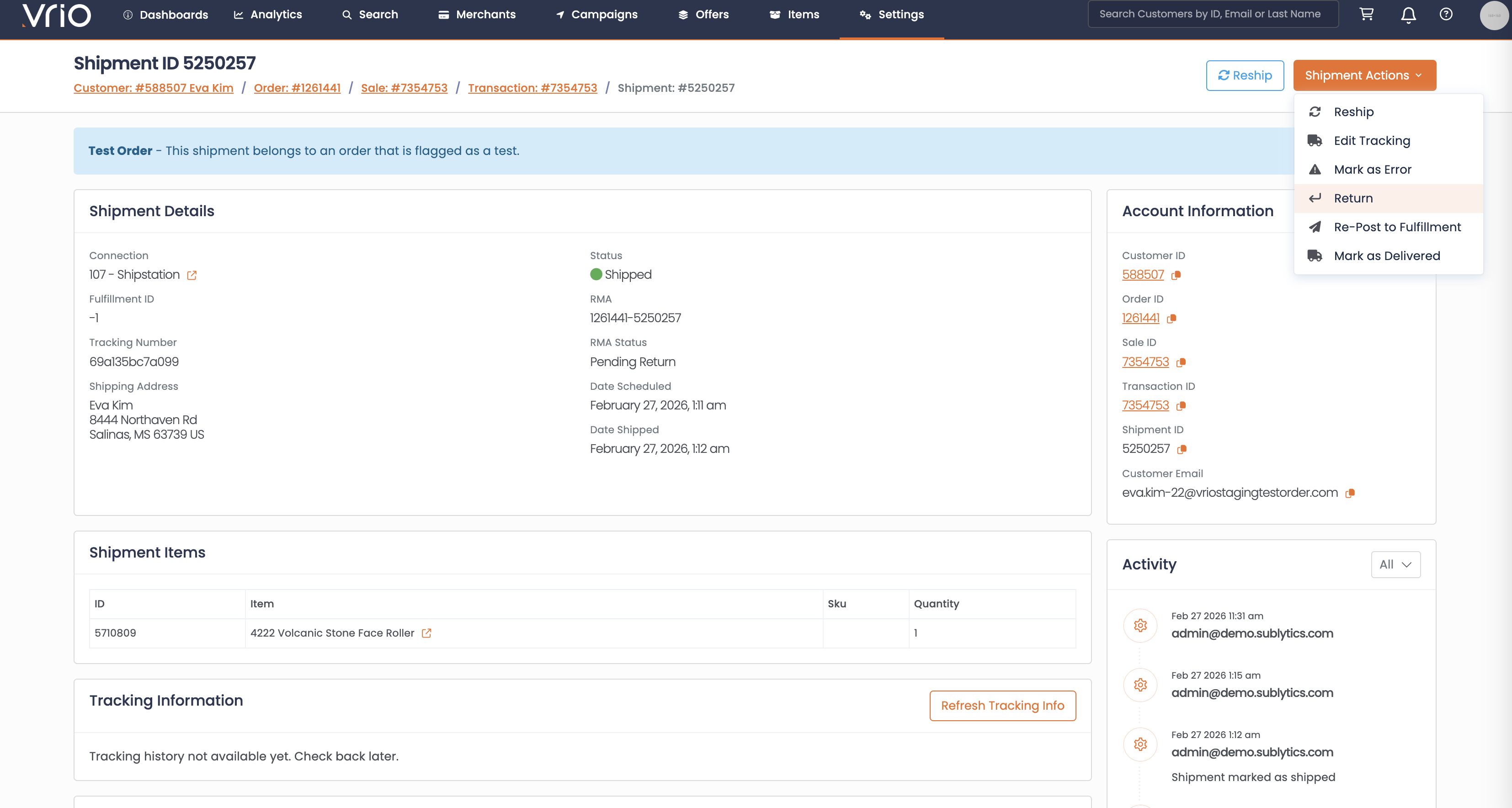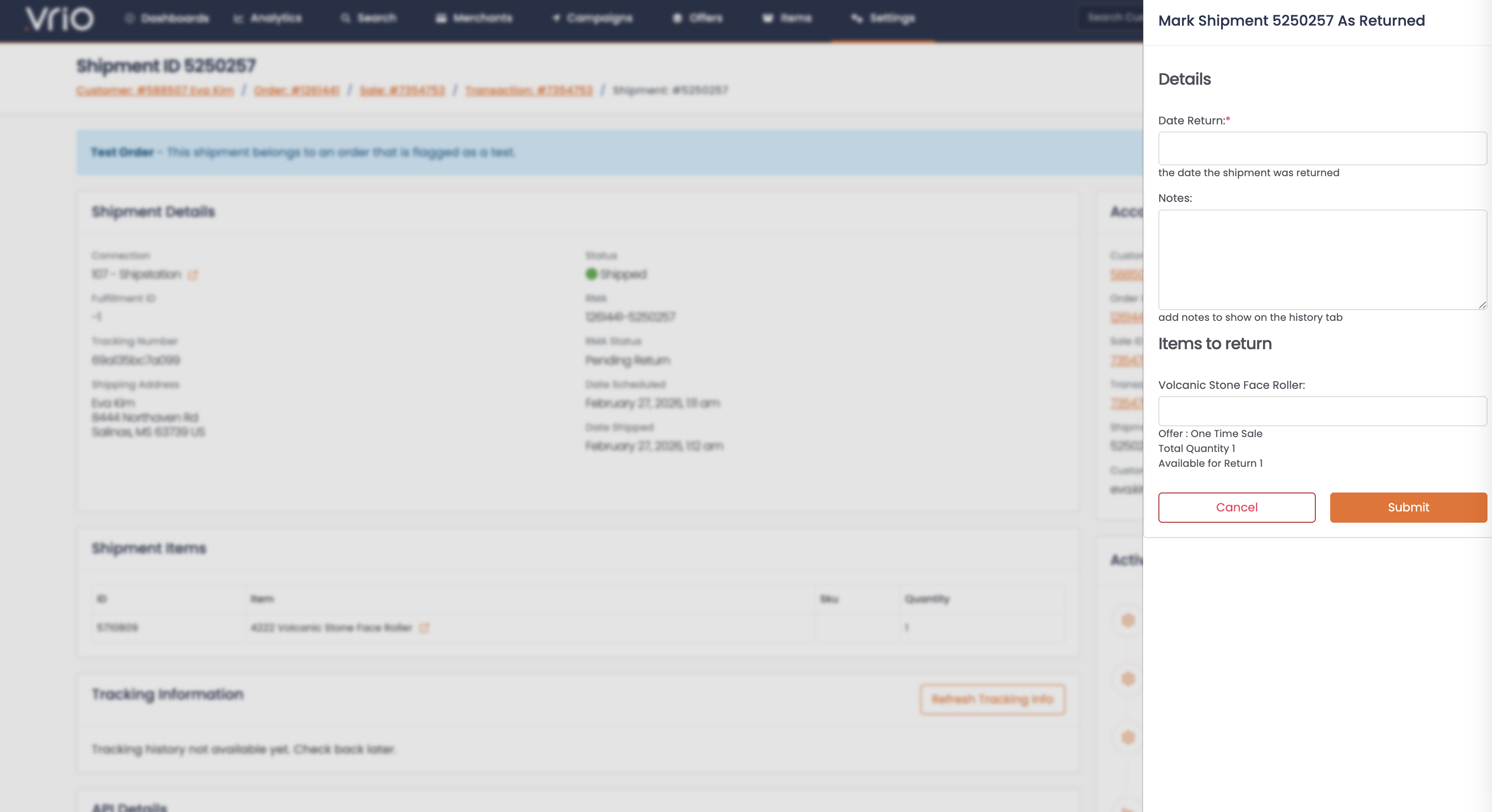 - The shipment is marked as Returned in Vrio