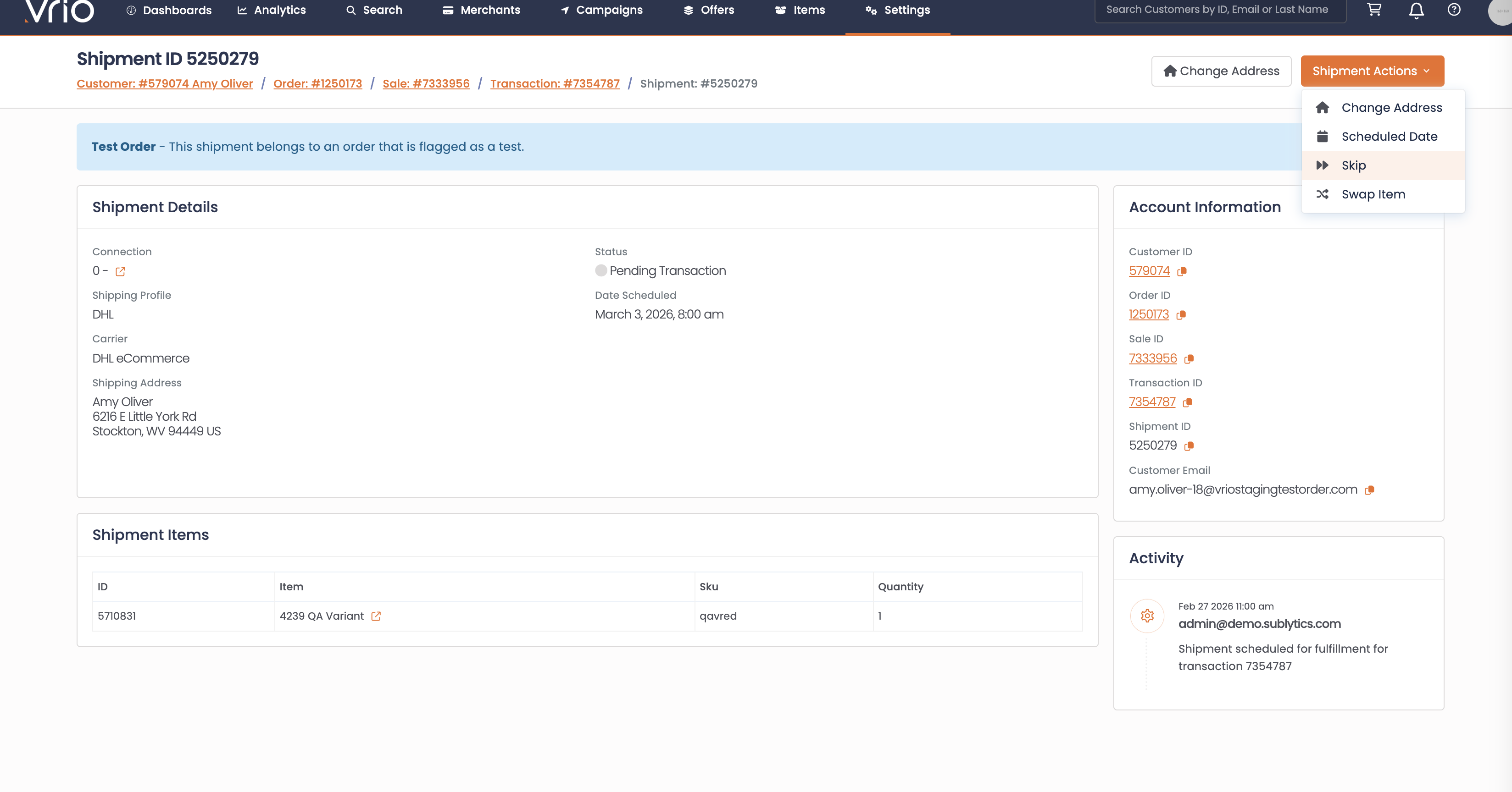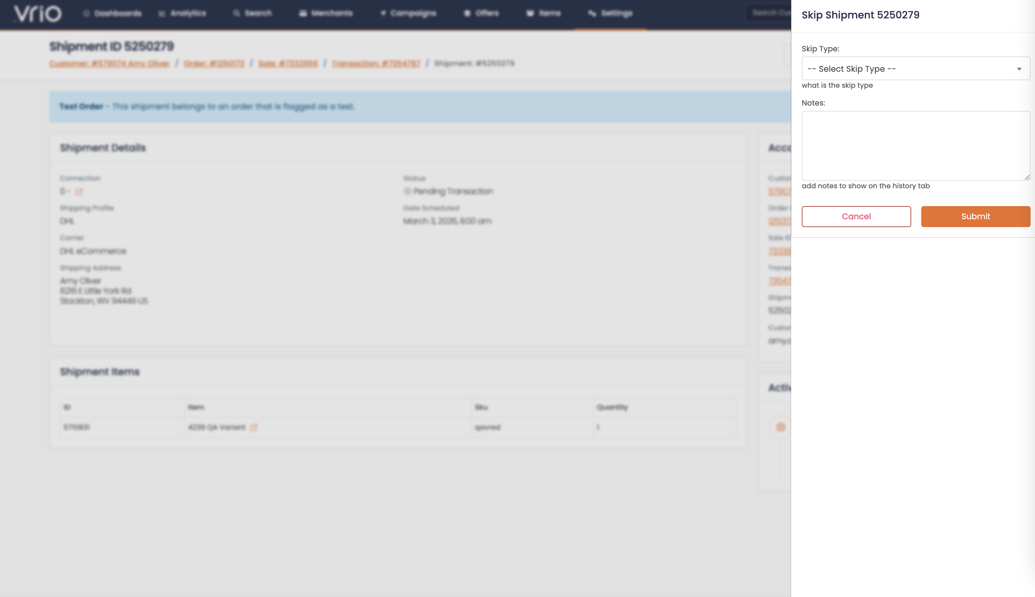 On the shipment detail page, click Skip from the Shipment Actions.