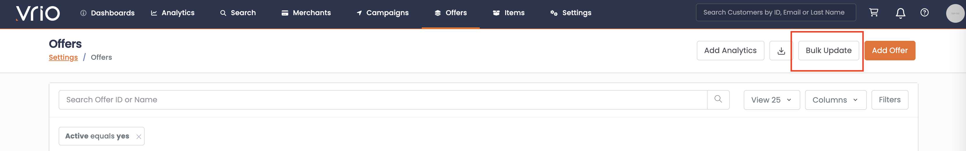 Update multiple offer records at once by uploading a CSV file. This is useful for bulk updating offer settings, responders, upsell configurations, or status flags across multiple offers.