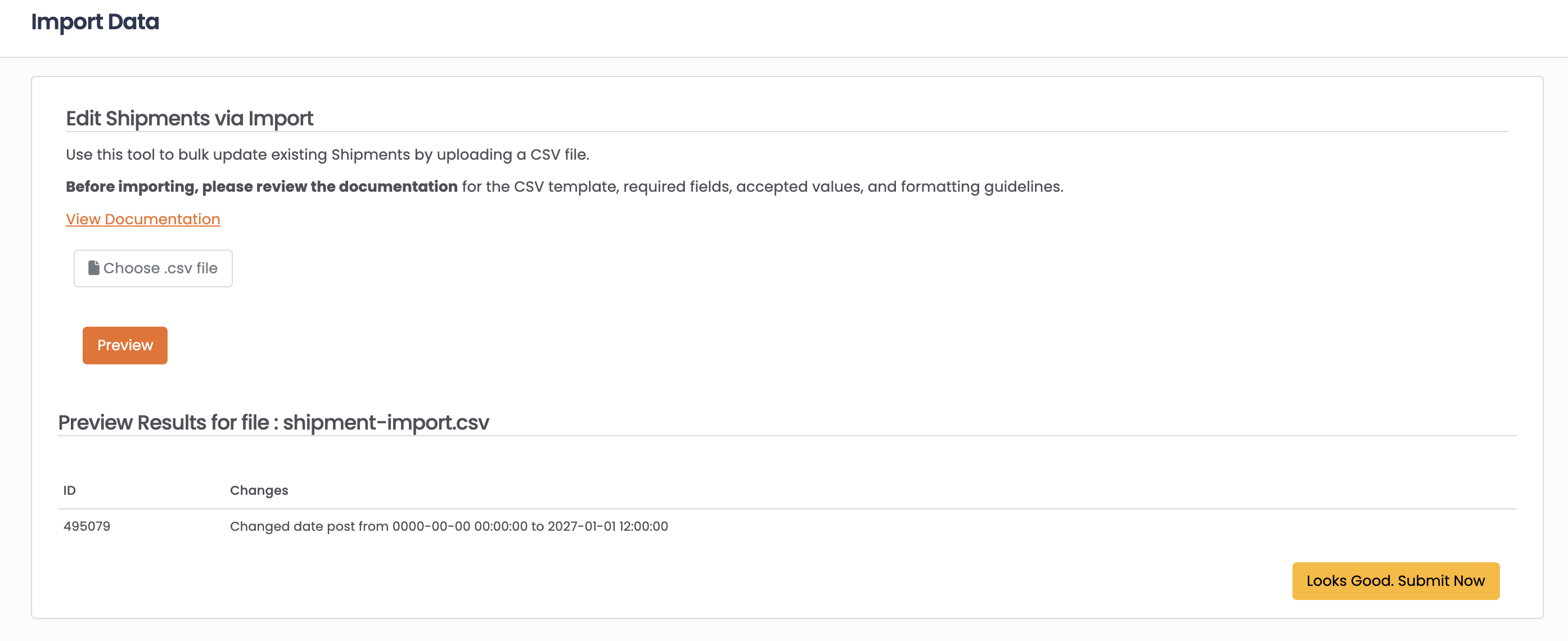 Update multiple shipment records at once by uploading a CSV file. This is commonly used for adding tracking numbers, updating shipment dates, or modifying shipment status.